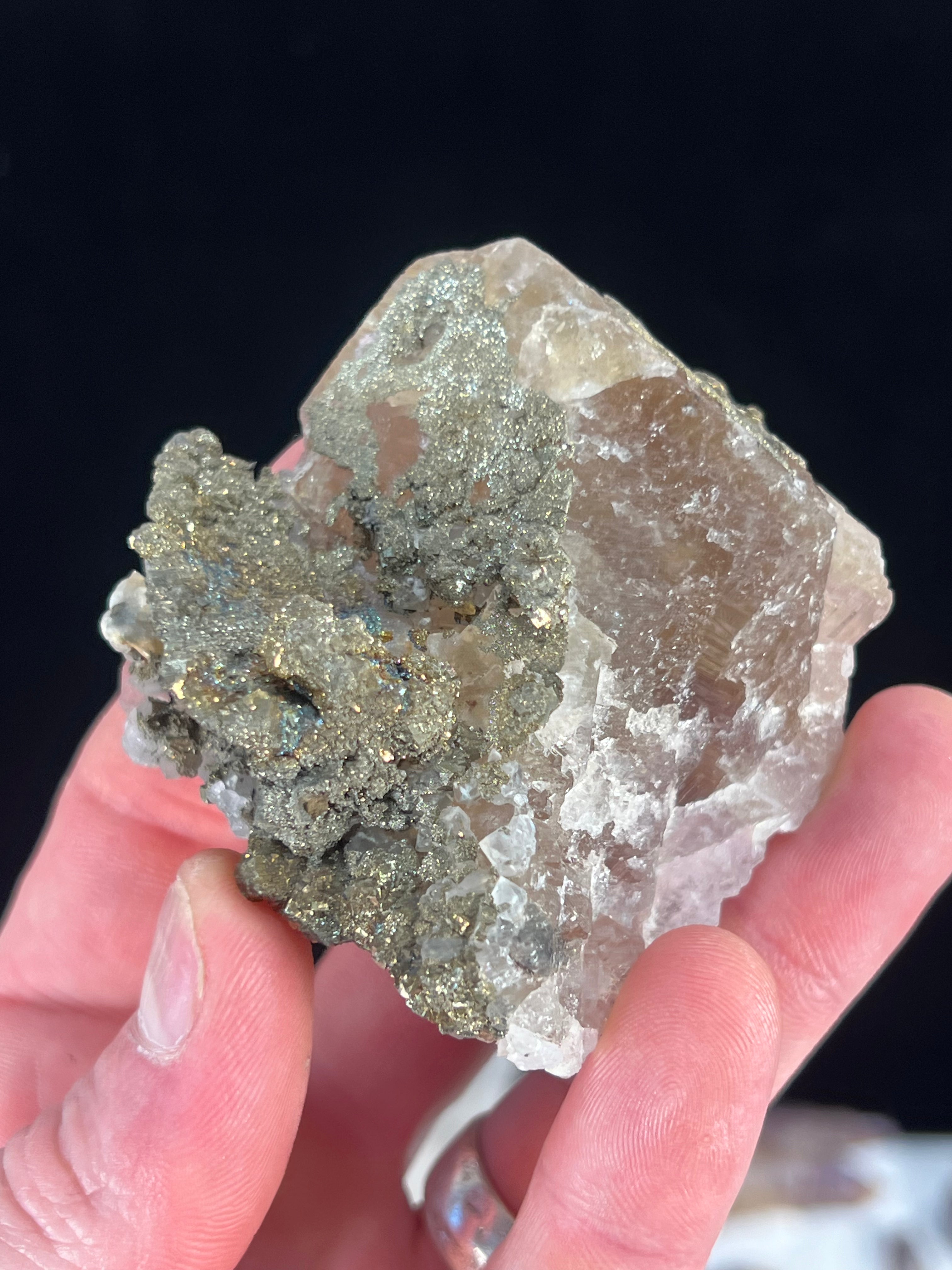 Peach colored fluorite with pyrite from el hammem morrocco