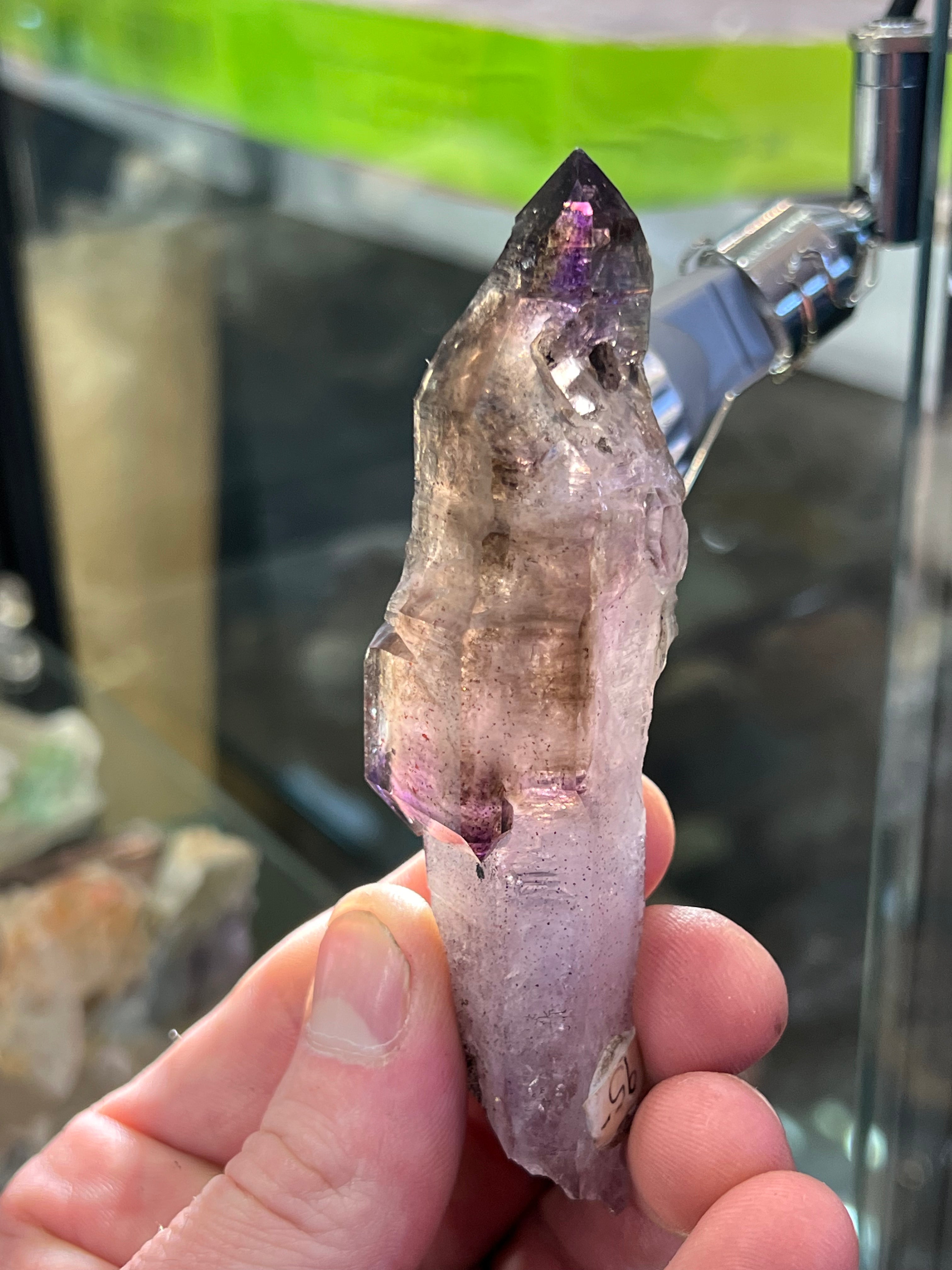 A beautiful smoky amethyst quartz scepter specimen with inclusions of Cacoxenite and hematite.