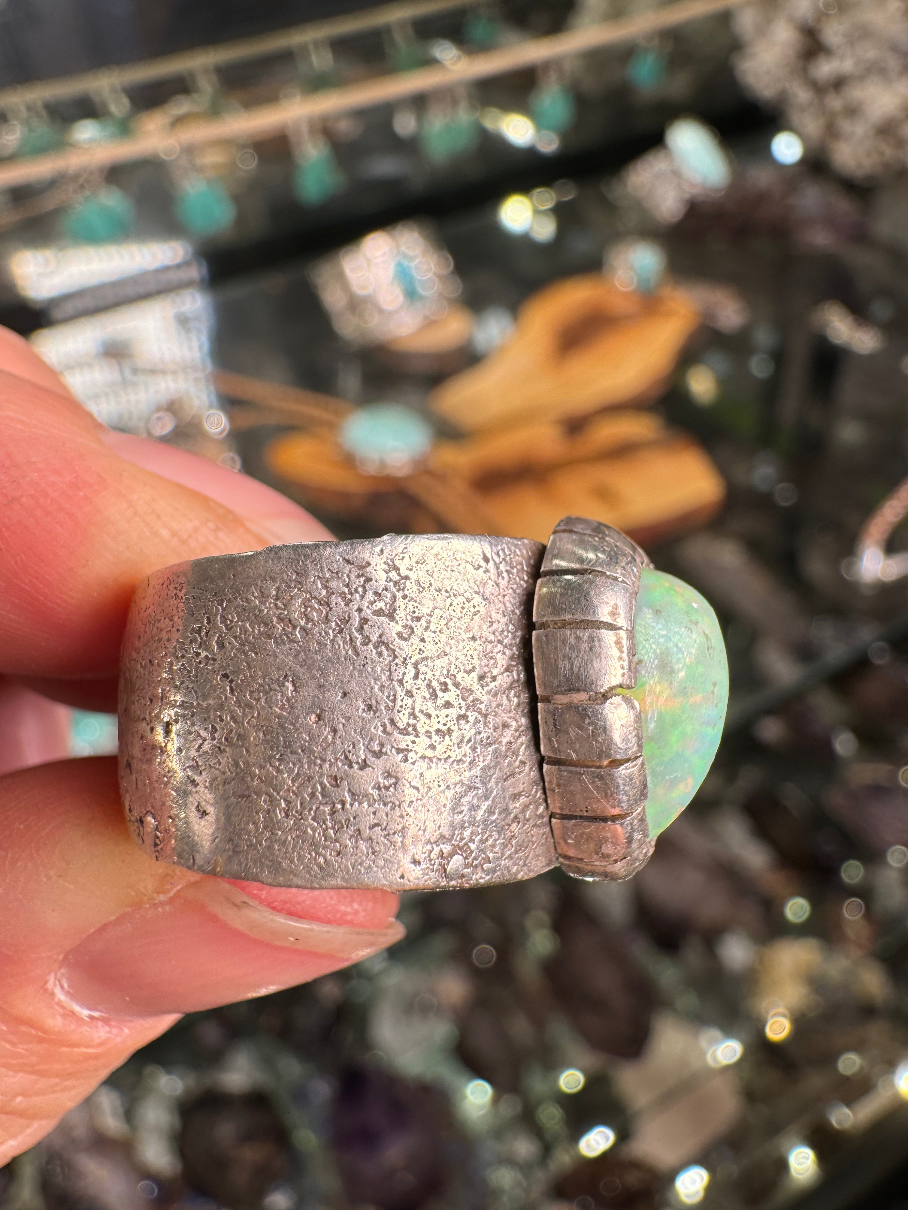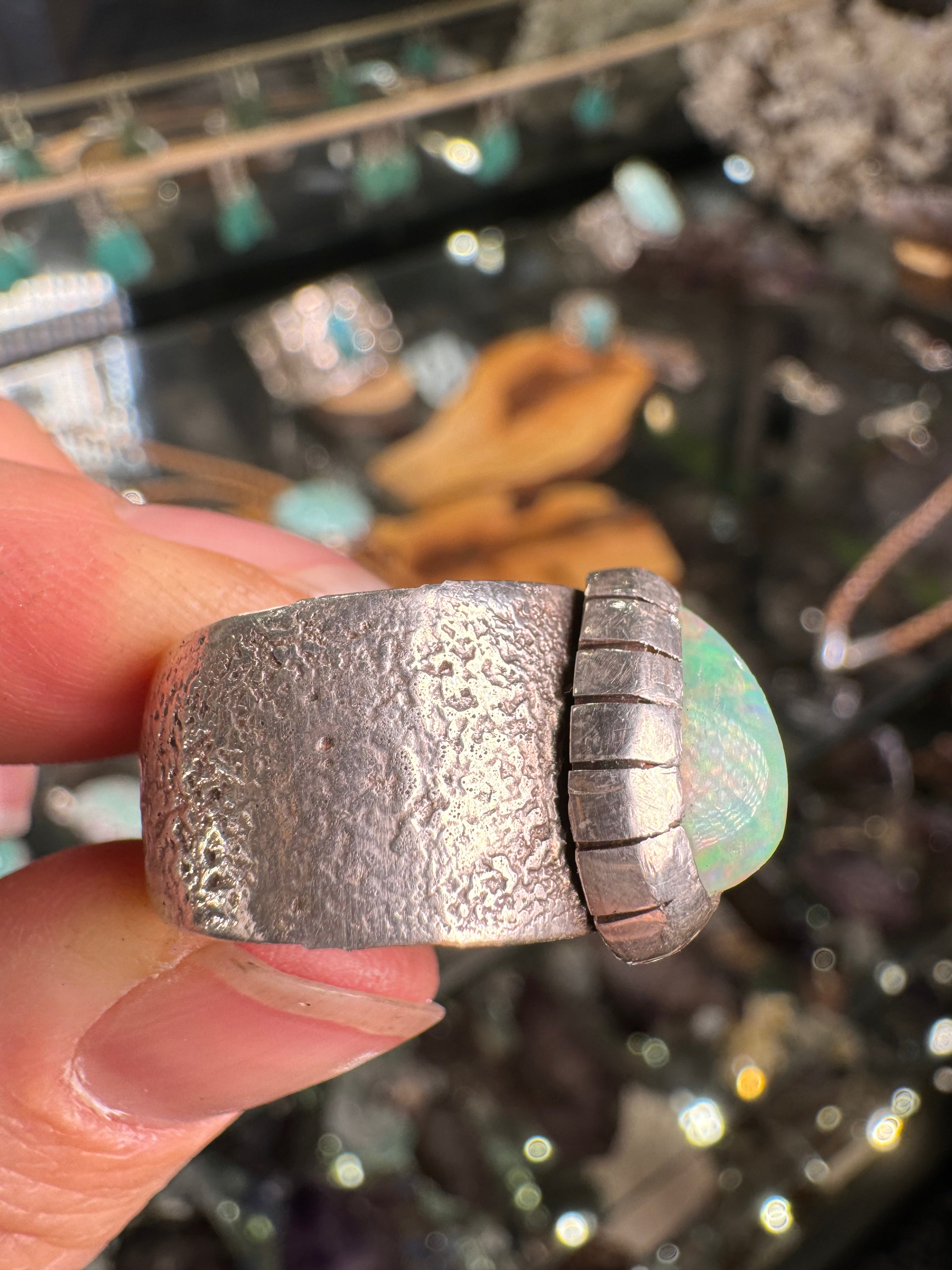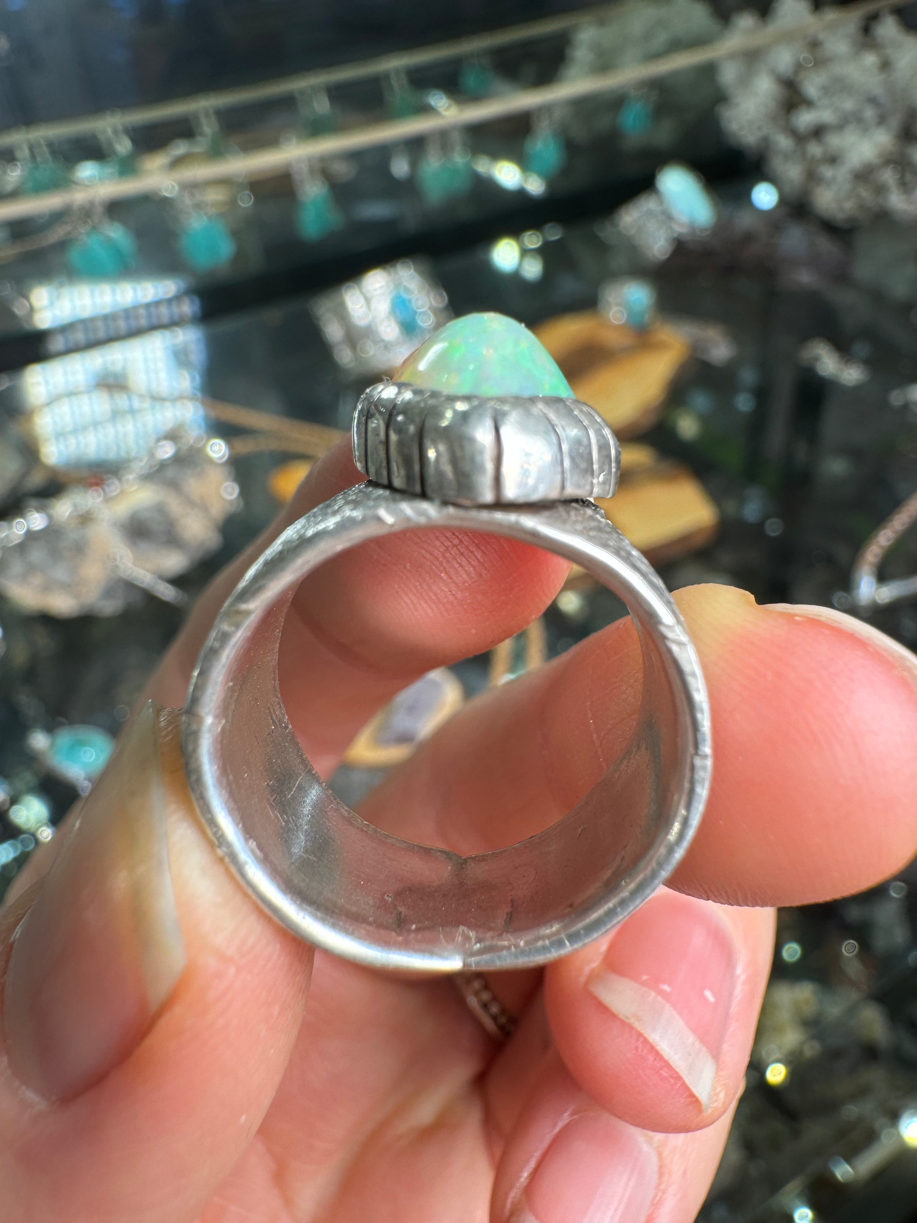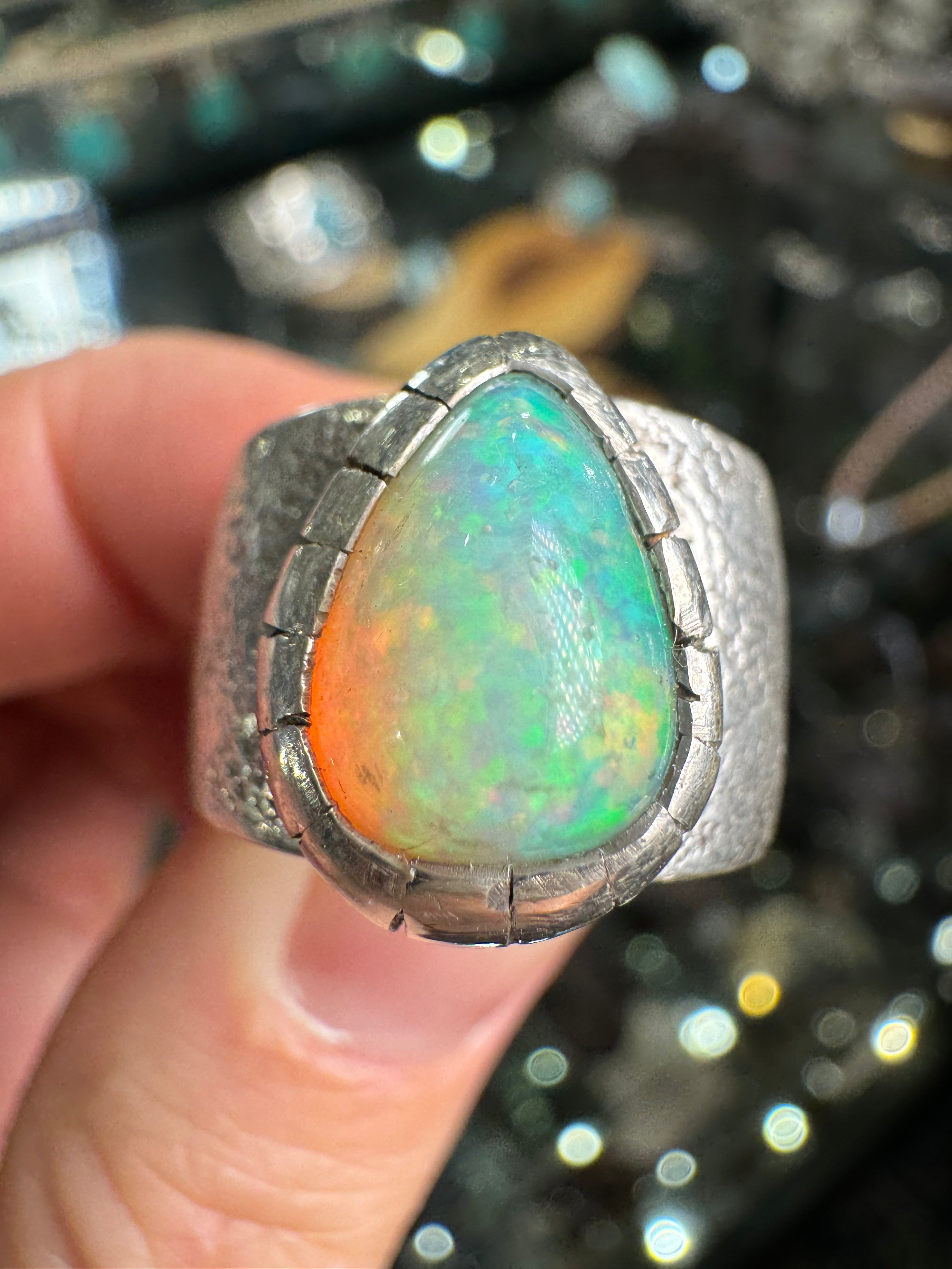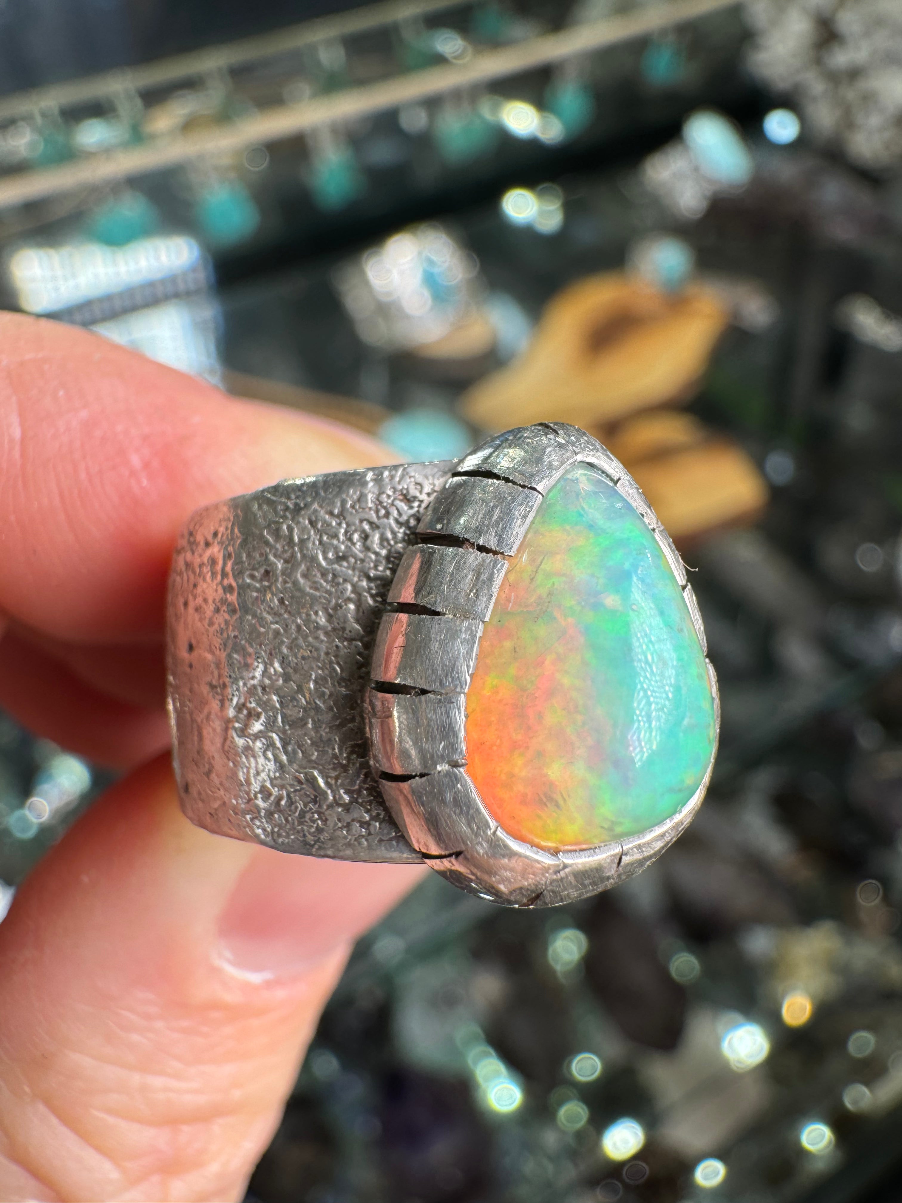 Tear drop Ethiopian Welo Opal ring set in Sterling Silver. Castellated bezel and reticulated wide band